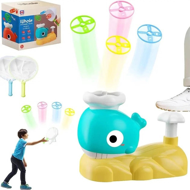 Поміщаючи диск на спину кита та натискаючи педаль, ви запускаєте іграшку, яка злітає у повітря. Літаючу тарілку можна зловити за допомогою спеціального сачка. Існують різні варіанти гри, і ви можете насолоджуватися грою з друзями та навіть з домашніми тваринами. Ця іграшка створює веселу атмосферу на свіжому повітрі та сприяє розвитку командного духу.